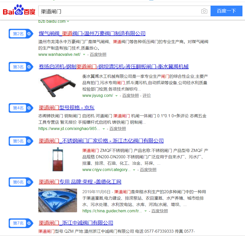 河北某某水工机械有限公司是一家从事设计制造抓斗清污机、污水专用闸门、渠道闸门等产品的企业,公司拥有精良的生产设备和技术团队,公司生产的产品结构合理,性能可靠,品种齐全,经水利质量检验部门检测,各项指标都是能达标行业标准的。如果有这方面需求的朋友可以联系他们看看,为了打开互联网销售市场,公司的负责人也是选择和厦门北渔seo优化平台的合作商进行合作优化推广,下面一起来看看优化的效果吧!